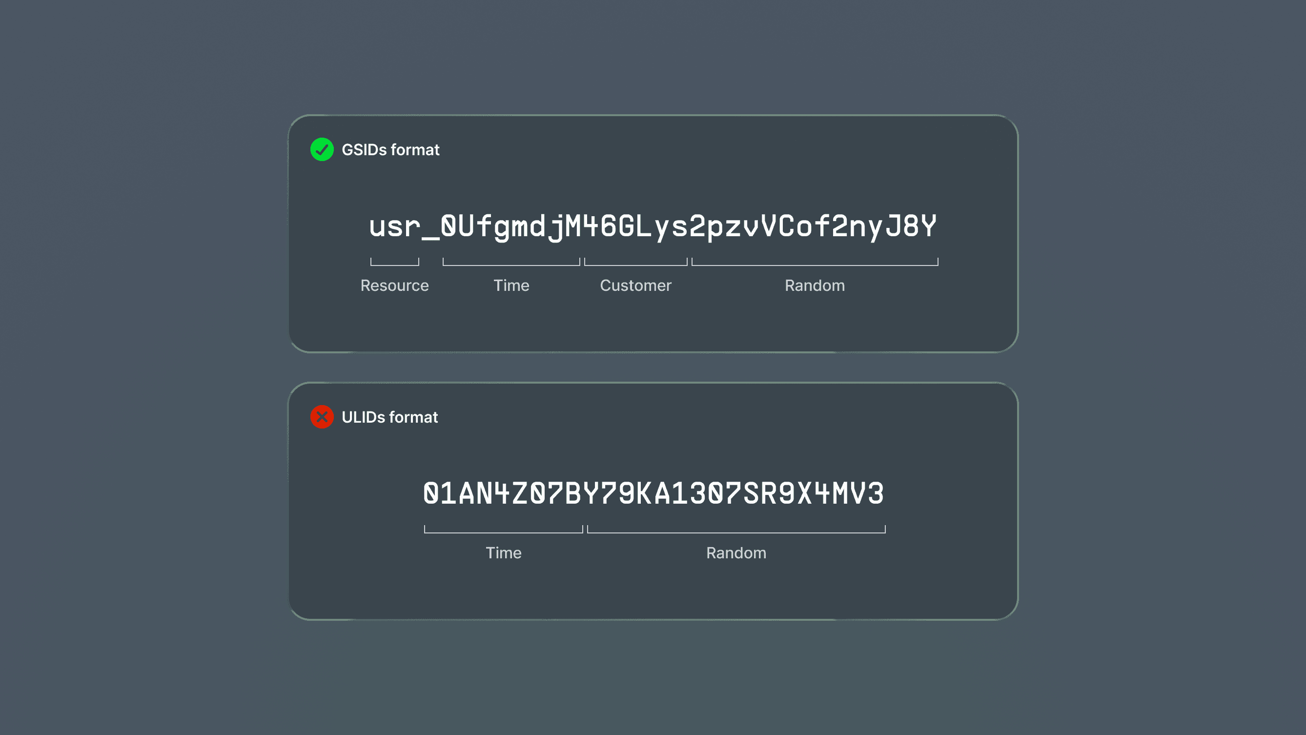 We couldn’t find a standard format that could meet all these requirements, so we decided to build our own, drawing inspiration from the existing ULIDs and the Stripe Object IDs.